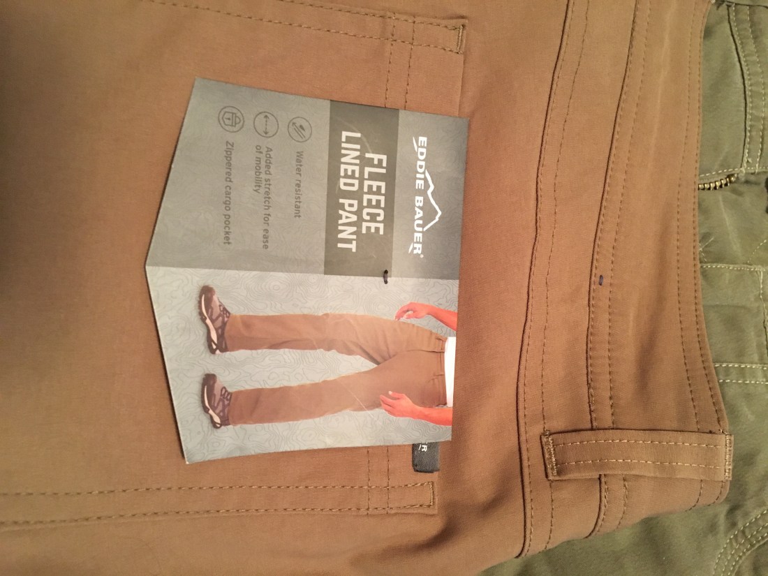 Who knew that lined pants are the answer? I never realized that if I’m cold, I should keep my legs warm. I have been living by the old sailor’s adage: if your toes are cold, put on a hat. Instead on putting on a hat and vest, the heat generated from the legs moves upward (of course) and warms my core. Lined pants. Now I’m a believer.