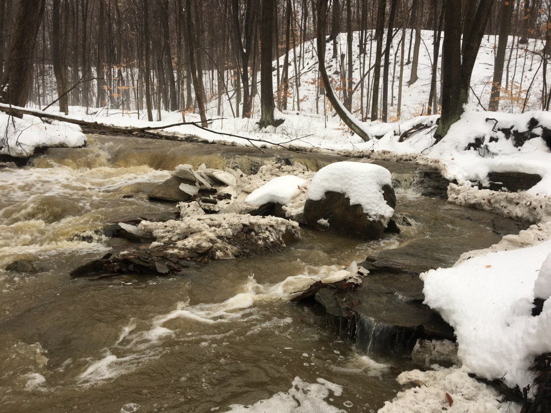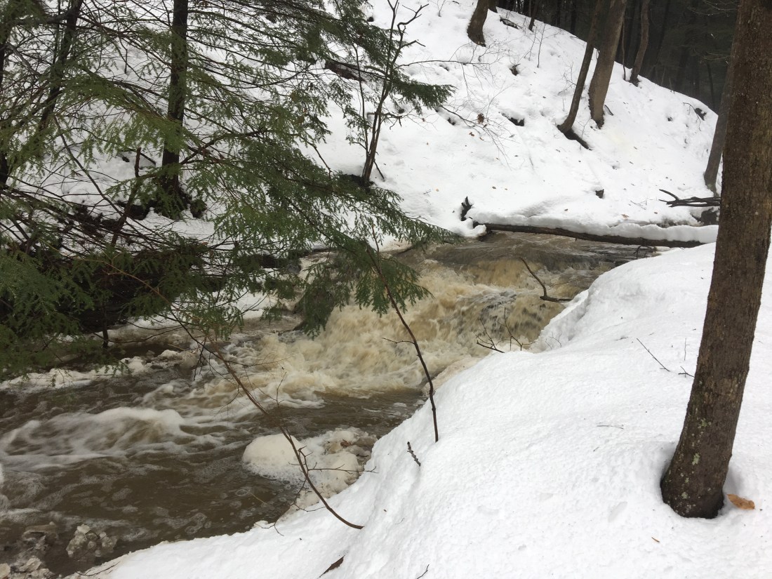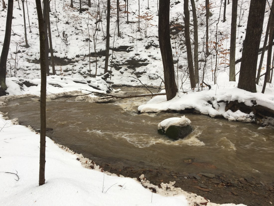 One of these days I’m gonna get lucky and see this in all its creek shaping flood glory. I thought it might be today given the foot of snow over the weekend then today’s rain and 40 degree temps. The creek bed was full but not roaring. One of these days I’m gonna watch the boulders tumble down the creek.