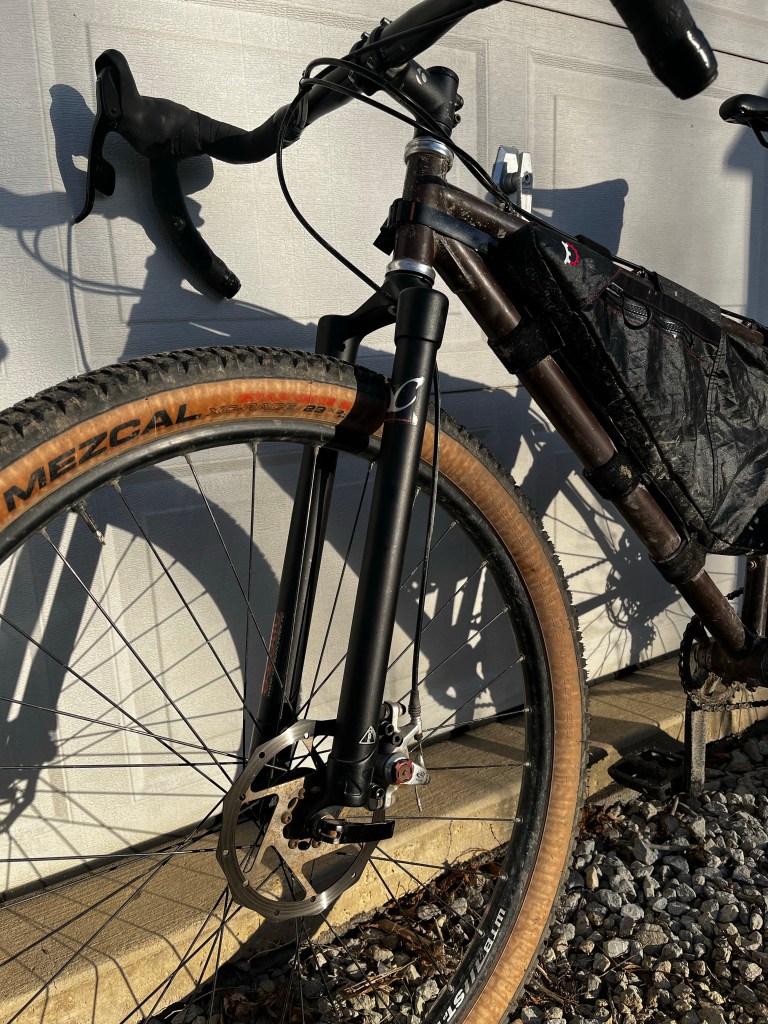 Recently handed-down rigid aluminum fork (who even rides an aluminum fork? Hey, it was free!) that replaced a 10+ year old, never-serviced RockShox suspension fork