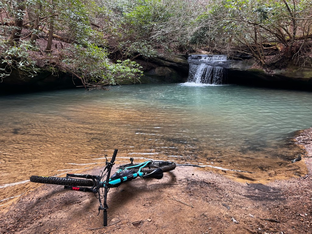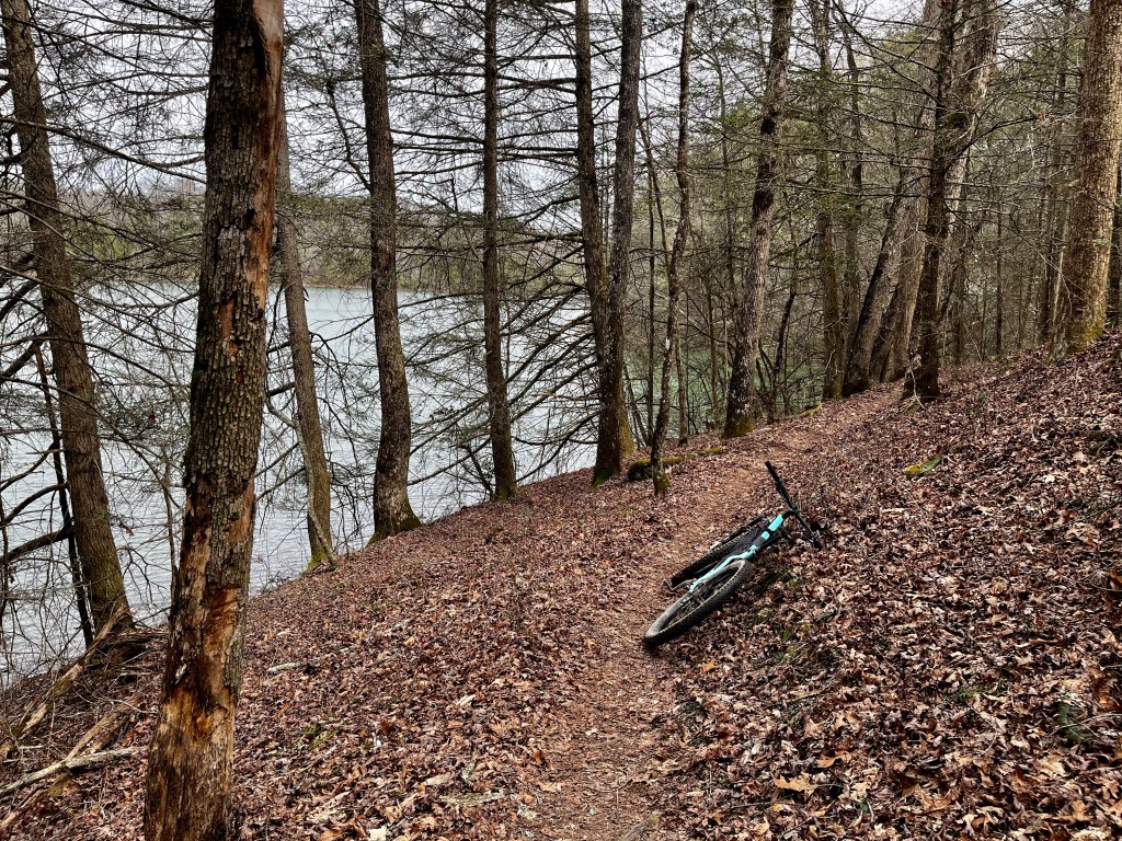 Then it was on to explore another section of the Sheltowee Trace Trail near Laurel Lake, Kentucky.A nice place to have a houseboat!This segment of trail leading to Van Hook Falls was one of the most beautiful short sections of trail I’ve ever ridden The controlled burning of the undergrowth gave the lakeside trail a smokey aura. The Sheltowee Trace is a hiking trail, and some sections just aren’t rideable, but the hiking is just as enjoyable.