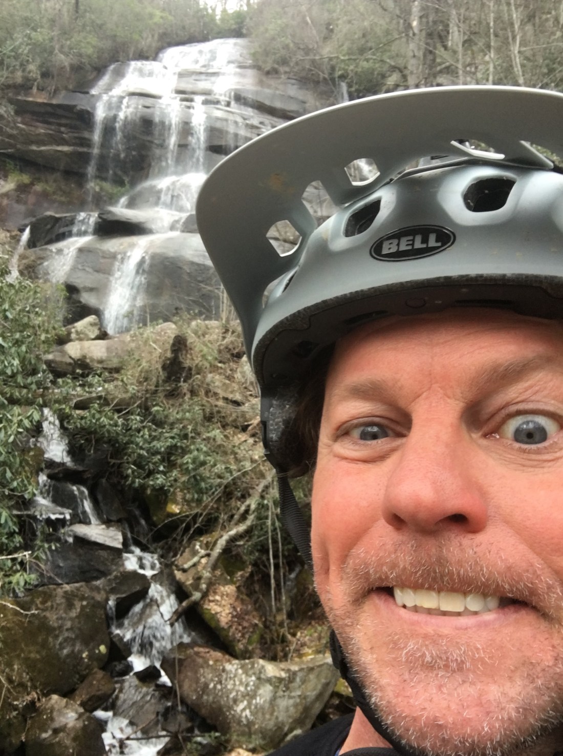 LEVITATING GEORGE: A stop at the falls on thew way up to Daniel Ridge. After that, we climbed gravel up to the Wormhole, then rode Butter and Cat Gap, with a tour of the hatchery at the end to see the adult rainbow trout stockers.